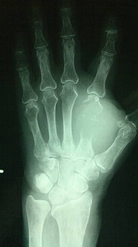 <br /><br />Женщина, 60 лет. Плазмоцитома.<br /><br />Опухолевый узел в области кисти болел и увеличивался в размерах с течением времени не смотря на проводимое лечение.<br /><br />