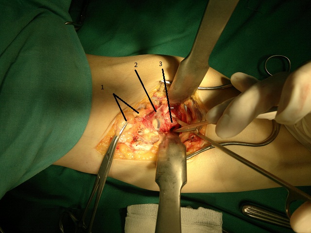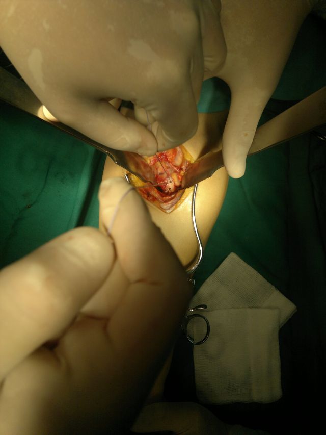 Потешу ваше любопытство сегодняшней операцией )))<br />Мужчина, 48 лет, профессионально занимается бодибилдингом, не курит.<br /><br />Впервые почувствовал "хруст" и боль в области локтевого сгиба во время тренировки около 3 месяцев назад, однако за медицинской помощью не обращался. Лечился самостоятельно путем эластичного бинтования в течение 4 недель. После чего снова начал тренироваться и при первой же нагрузке мышц-сгибателей предплечья почувствовал в очередной раз "щелчок" и острую боль. За медицинской помощью обратился спустя 2 месяца.<br /><br />Во время операции S-образным доступом в локтевой ямке выделено разорваное дистальное сухожилия бицепса, 10% волокон которого сохранили свою точку крепления, остальная часть сухожилия мышцы была спаяна с окружающими тканями (1). Выделена плечевая артерия на уровне бифуркации (2) и срединный нерв, а также область бугристости лучевой кости. На протяжении 2 см рассечена и отпрепарована надкостница (3) - предполагаемое место реинсерции. После чего в переднем кортикальном слое сделано отверстие для анкера, импактирован анкер, одной из нитей которого прошито сухожилие. После чего выполнено проведение дистального сухожилия бицепса под сосудисто-нервным пучком и нити связаны в положении сгибания в локтевом суставе до 90 градусов. Послойный шов, дренирование раны. Иод. Ас. повязка. Гипсовая лонгета в среднефизиологическом (или пронации) положении предплечья.<br /><br /><br />