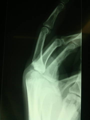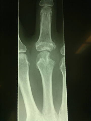 Выкладываю в плане общеобразовательном, т.к. в нашей клинике мы не занимаемся лечением подобных вещей, а всего лишь выявлением.<br /><br />Около 2-х лет назад у этого 47-летнего господина появились ноющие ночные боли в области 3 пястно-фалангового сустава правой кисти, с которыми он обратился в поликлинику по месту жительства, где были сделаны первые рентгенограммы, однако пациент продолжал лечиться консервативно. Спустя 1 год симптомы заболевания не уходили и пациенту на консультации у ортопеда было предложено оперативное лечение с предварительным гистопатологическим исследованием опухолевидного образования. Исследование было проведено 2-ды и ни в одном из них не было выявлено злокачественных клеток. Операция плановая, ничего не предвещает беды, все откладывается еще на год.<br /><br />Затем пациент попадает в клинику хирургии верхней конечности, где делаются повторные рентгенограммы, на которых выявляется резорбция (остеолиз) костной ткани в области головки 3 пястной кости. Последняя увеличена в размерах, безболезненна на ощупь, кожа над ней спаяна, беспокоит незначительная боль ночью.<br /><br />