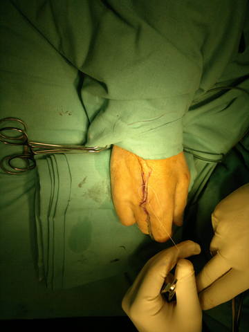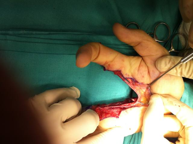 Да, в принципе-то ничего особенного: из фигурного доступа, постепенно выделяются общие пальцевые артерии и нервы на уровне бифуркации и выше до ладонной дуги. Далее накладывают лигатуры в месте отхождения собственных пальцевых артерий и нервов. По ходу операции перевязываются и коагулируются все видимые вены. Непосредственно узел опухолевый удаляется на максимально далеком расстоянии, руками его не трогают, не давят, не пальпируют и вообще манипулируют очень осторожно.<br /><br />Межпястный промежут ушивают, дренируют рану. <br /><br />
