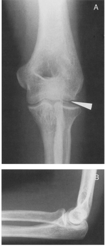 Женщина, 47 лет. Получила травму локтевого сустава в результате падения с высоты собственного роста, около 3 месяцев назад. На момент осмотра контуры локтевого сустава сглажены, беспокоит боль как при движениях, так и в покое. Объем движений резко ограничен и находится в пределах 40 градусов.<br /><br />Рентгенограммы:<br /><br />